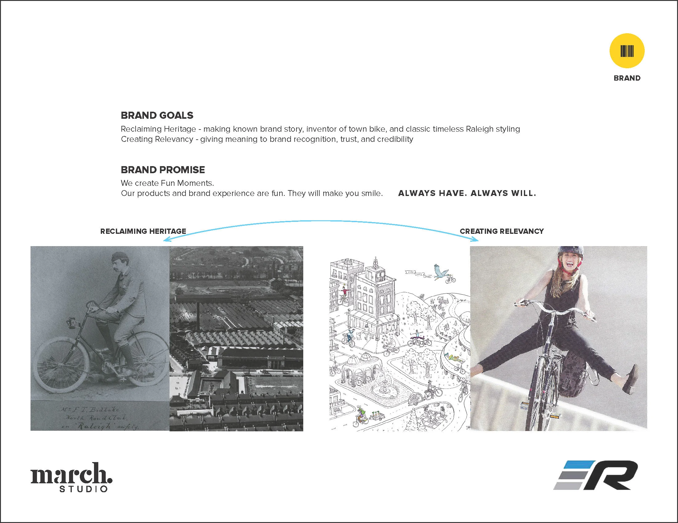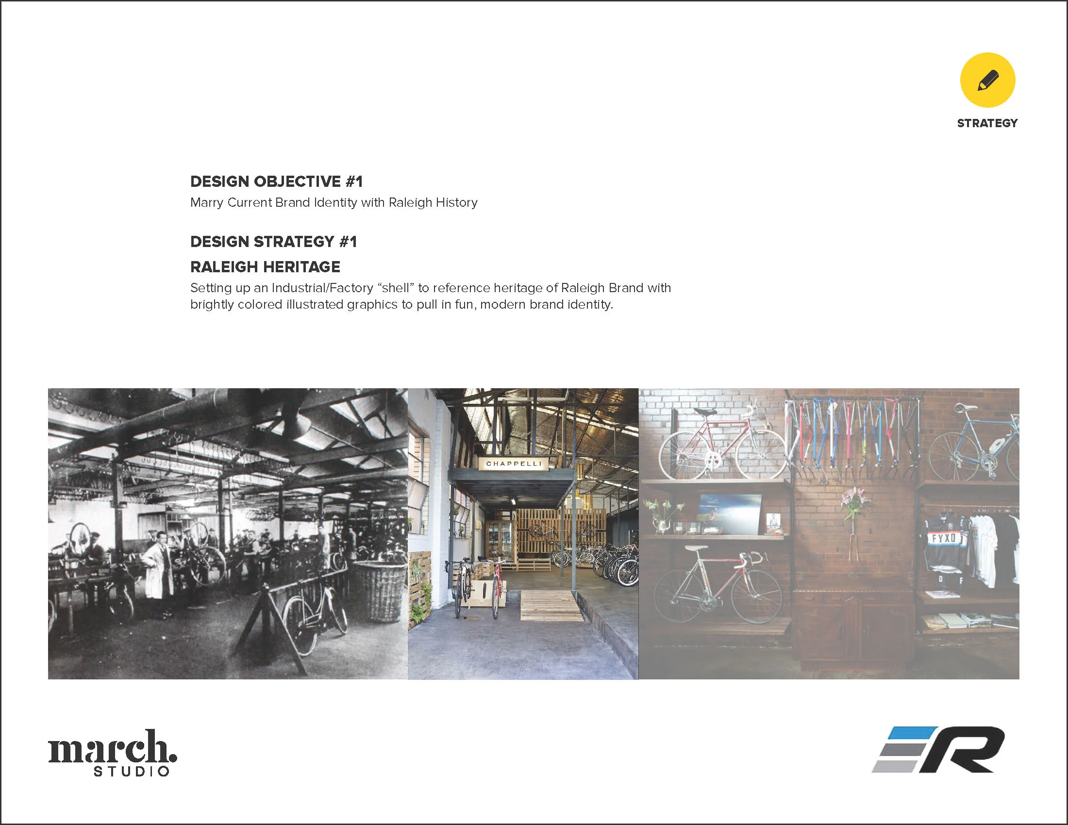 We established a brand driver, our way to make visual the big idea for Raleigh. Our big idea, “a playful, modern identity with the integrity and history of the brand,” was illustrated in a playful collage. After gathering specific INSIGHTS about the brand, location, competition and other factors we develop the design objectives that this project will seek to incorporate.