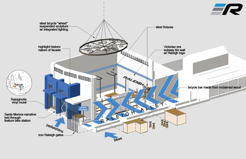 For Raleigh, we wanted to celebrate the long heritage of the brand through industrial references in the finishes and displays. We wanted to layer the new fun brand identity with the historical context. The original tagline for Raleigh Bikes, “Getting Around & Getting Healthy,” is still current with today’s busy lifestyle. Finally, we also want to layer an aspect of community into the design to allow for the store to be a central hub for the local Santa Monica residents.